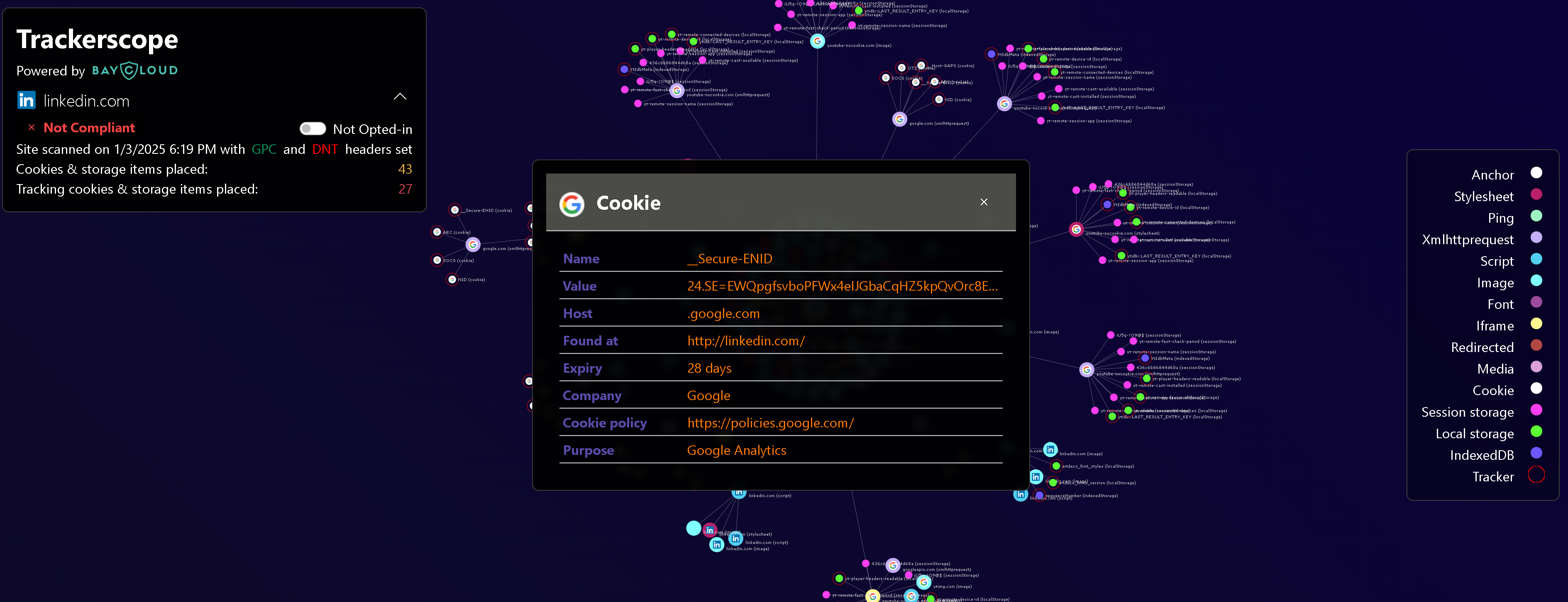 Automatic recurrent scanning detects all cookies and browser-based storage whatever its source. Get prompted when changes are detected such as new cookie-using apps being installed, or whenever the configuration needs updating. Real-time indication when potentially damaging "malware" or unrecognised content is found and automatically blocked.